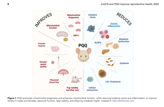 PQQ则是杰出的“总建筑师”,其最独特的能力在于促进线粒体生物合成,即建造更多、更新、更健康的“能量工厂”。此外,它还能调节脂肪酸代谢、减轻炎症。其关键作用包括保护生育能力:在动物模型中,PQQ能改善卵巢功能,增加排卵数和活产幼崽数,甚至能部分挽回化疗药物对生育力的损害;同时能优化宫内环境:补充PQQ可增加大鼠的胚胎着床数和存活胎儿数,上调胎盘的抗氧化基因,并增加母乳中的免疫球蛋白;更令人瞩目的是其阻断代谢病“代际传递”的潜力:在母体肥胖的小鼠模型中,孕期补充极低剂量的PQQ,能显著改善子代成年后的肝脏健康(减少脂肪堆积和炎症),其保护效应可持续至成年,即使子代断奶后不再补充。